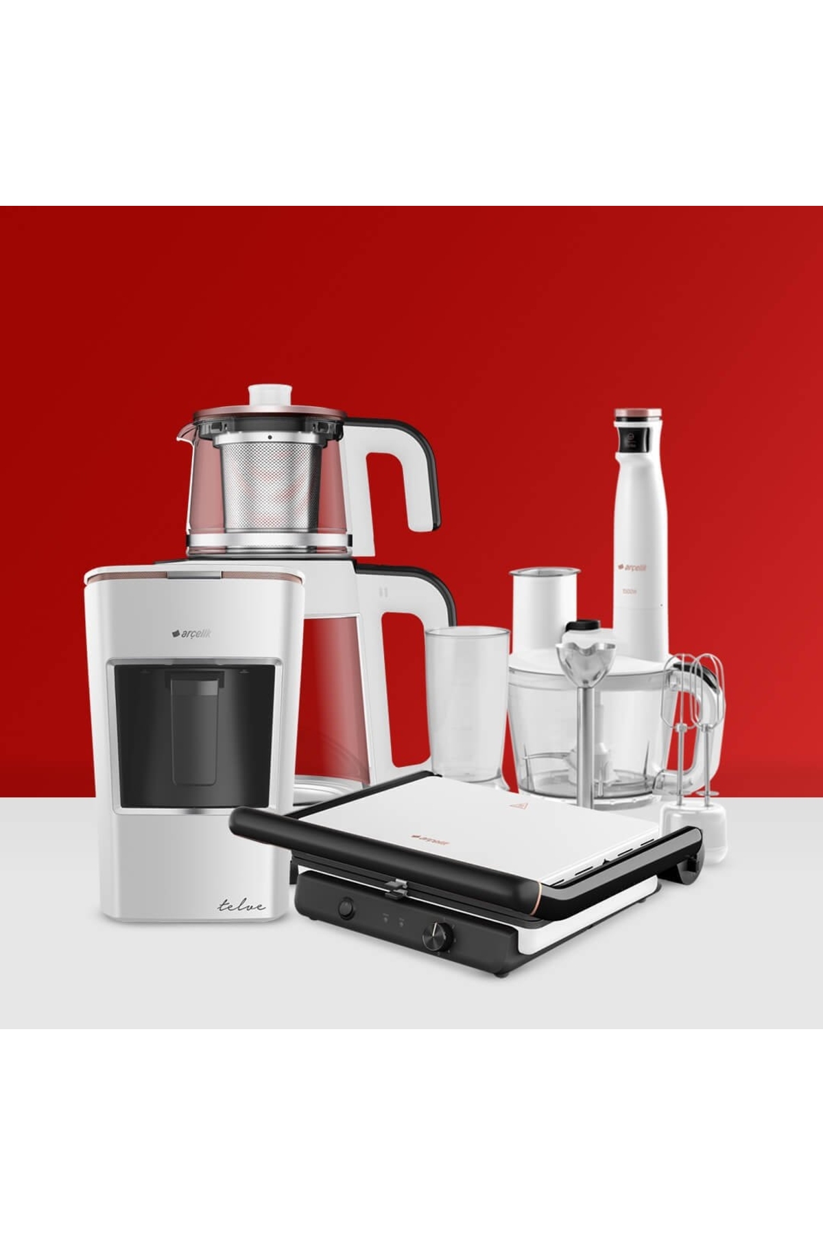 Yeni trend çeyiz seti içerisinde bulunan Arçelik çay makinesi, 1900 Watt gücü ile yüksek sağlayan bir üründür.; 0,8 L demlik kapasitesi ve 2 L su ısıtıcı kapasitesi özelliklerine sahip olan çay makinesi, küçük ev aletleri çeyiz seti içerisinde tercih edilir.; Kahve makinesi, çay makinesi, tost makinesi, el blender seti gibi yeni teknolojiye sahip ürünler arasında 4'lü çeyiz seti oluşturulur.; Her biri yenilikçi tasarım ve özellikte, fonksiyonel kullanım sağlayan ev aletleridir.; En son teknoloji ile üretilen Arçelik beyaz küçük ev aletleri seti, dayanıklı, paslanmaz ve kolay temizlenebilir malzemeye sahiptir.; Ev aletleri içerisinde bulunan telve kahve makinesi, 670 W gücü ile yüksek sağlar.; Işıklı uyarı sistemi, ölçü kaşığı, sesli uyarı sistemi ve taşma önleme özelliği ile işlevsel kullanılır.; 1500 Watt gücündeki el blenderi, 2 farklı hız kademesi ayarına sahiptir.; 900 ml ölçü kabında yiyecekler tek tuşla parçalanabilir.; 6 dilim kapasitesi ile kullanılan Resital tost makinesi, 5 farklı ısı kademesi ile harika tostlar hazırlamak için tasarlanır.; Çıkarılabilir plakası hijyenik kullanım için yıkamaya uygundur.; Küçük ev aletlerinin malzemesi zaman içerisinde aşınmalara karşı dayanıklı plaka ve gövdelerden oluşur.; Bu sayede tercih edilecek set, uzun süre kullanım için özel tasarlanır.;